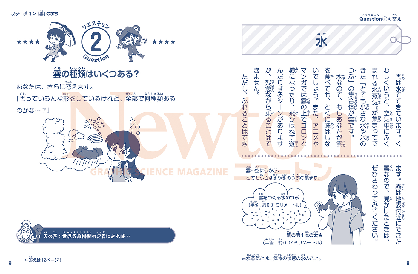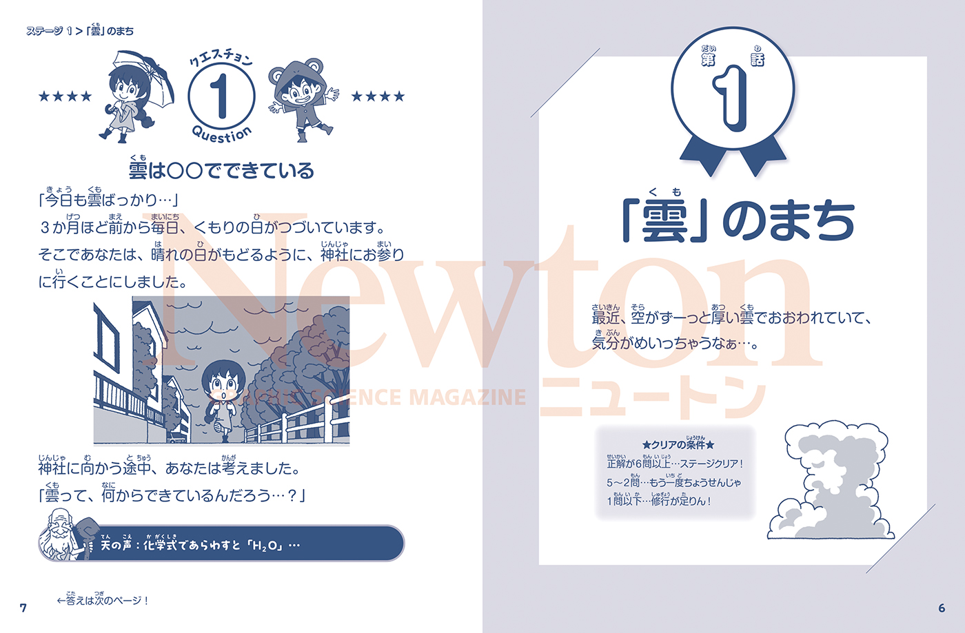 | 科学雑誌『Newton』がおくる、小学生向け新感覚クイズシリーズ・第7弾! 本書はストーリー形式で解き進めていく、天気のクイズ集です。楽しみながら、天気に関する知識を深めることができます。 「雲は○○でできている」「落下する雨つぶは○○型」などの基本的なことから、「雪の結晶の形は○○で決まる」などの発展的な内容、「ネコが顔を洗うと雨が降るって、ホント?」といった雑学まで、さまざまなタイプの問題を54問収録しました。ゆるっと身につくミニマンガや、じっくり読みたくなるコラムもあります。 (ストーリーのあらすじ) 3か月ほど前から毎日くもりつづきで、気分が落ち込んでいる少女。「晴れ」を願うために近所の神社にお参りに行くと、不思議な少年「ケロ」に出会う。ケロは「シキガミ様」のために、おいしいお菓子を集めたいのだという。少女はケロに協力することにしたが、その途中でさまざまな出来事が巻きおこる…! |