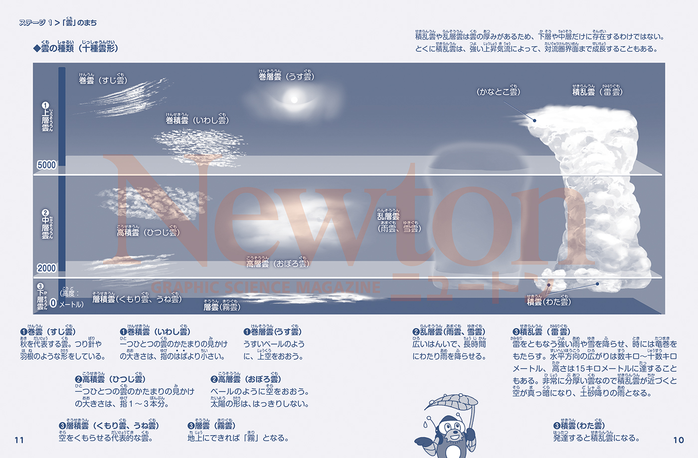 | 雨を降らせる雲は?/積乱雲ができやすい季節/かなとこ雲のヒミツ/落下する雨つぶは○○型/「あられ」「ひょう」「みぞれ」?/雪の結晶の形は○○で決まる/*さまざまな雪の結晶・雪結晶のダイアグラム・成長する雪の結晶・中谷ダイアグラム/雷と俳句/雷のとき、どこににげるべき?/渦を巻く風の正体1・2/台風は、どこで生まれる?/*台風の断面図/何がちがう? 台風・ハリケーン・サイクロン/パイロットがおそれる「ダウンバースト」/ダウンバーストが生じるしくみ ★ミニマンガ 夏の雷がおきるしくみ ★コラム 雲は0℃以下でもこおらない |