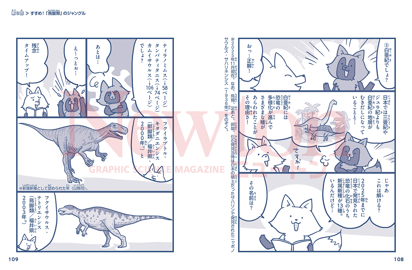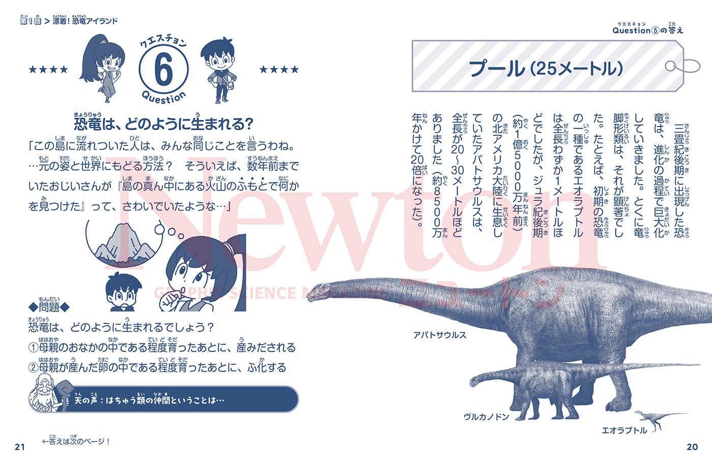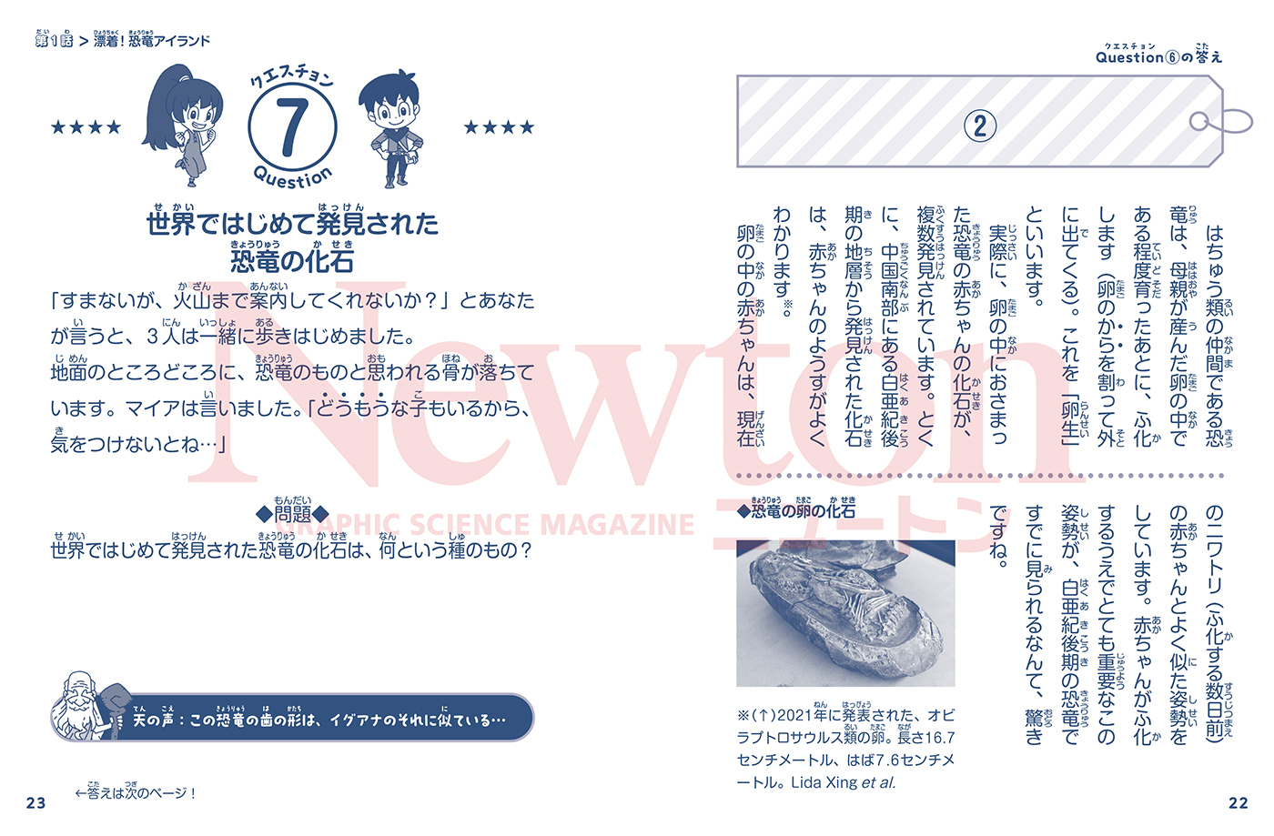 | 科学雑誌『Newton』がおくる、小学生向け新感覚クイズシリーズ・第8弾! ■どんな本? 本書は、知識ゼロでも「恐竜」についてクイズで楽しく学べる、小学生向けの書籍です。基本的な内容から、マニアもうなる深い知識、だれかに教えたくなるおもしろい雑学まで、さまざまな問題を収録しています。 ポイント ・日本の恐竜研究の第一人者で、カムイサウルスなどの名づけ親である「小林快次 教授」が監修! ・本格派なのに読みやすい! ・ストーリー形式なので、楽しみながら読み進められる! ・ゆるっと身につく「ミニマンガ」 ・じっくり読みたい「マニアコラム」 |