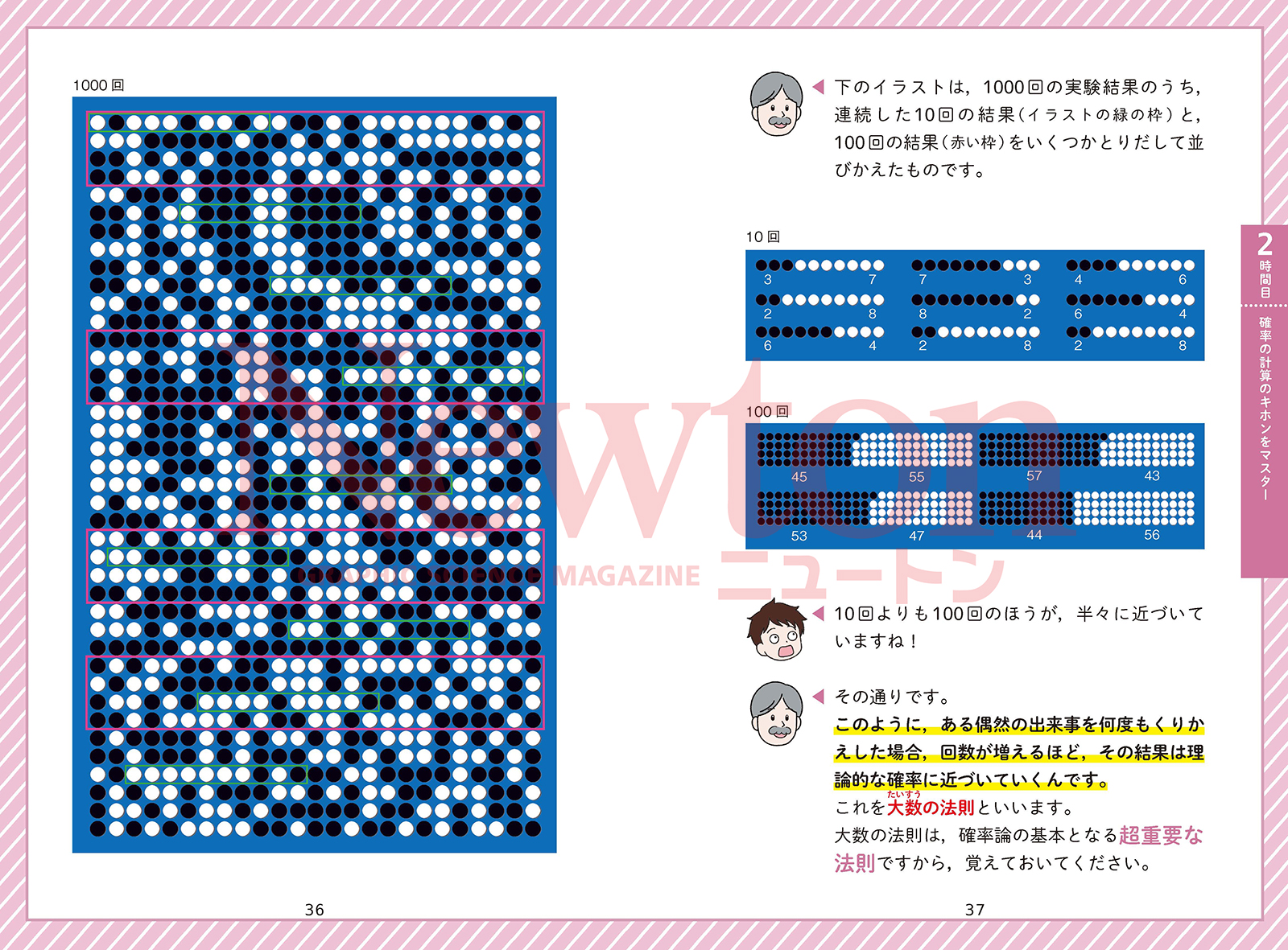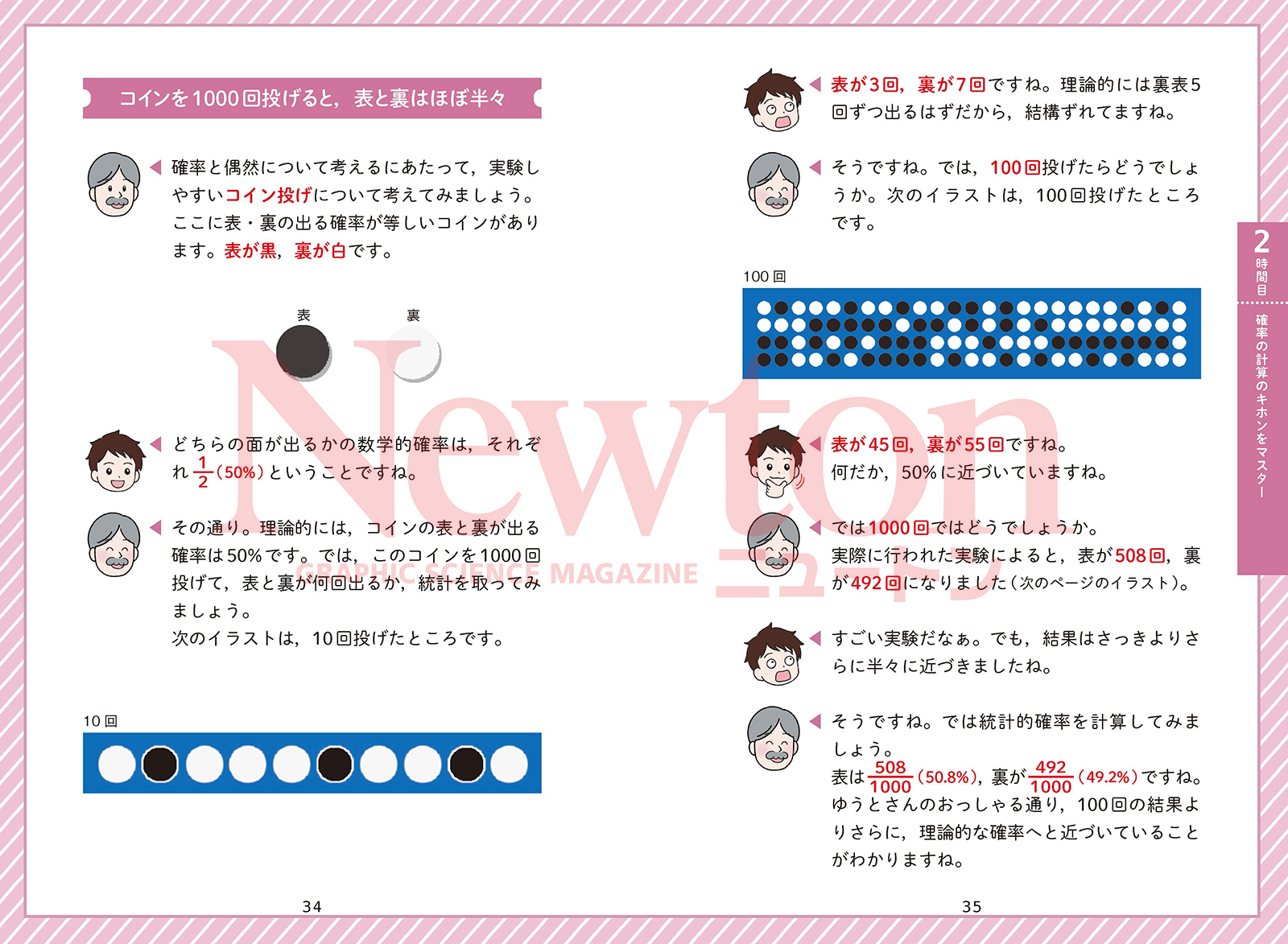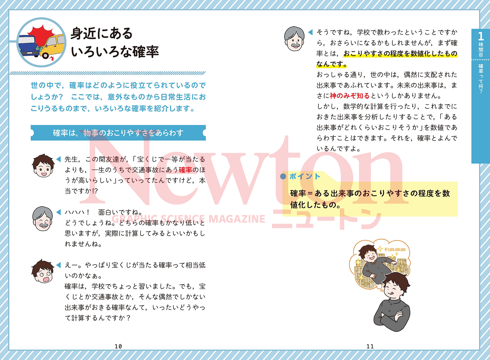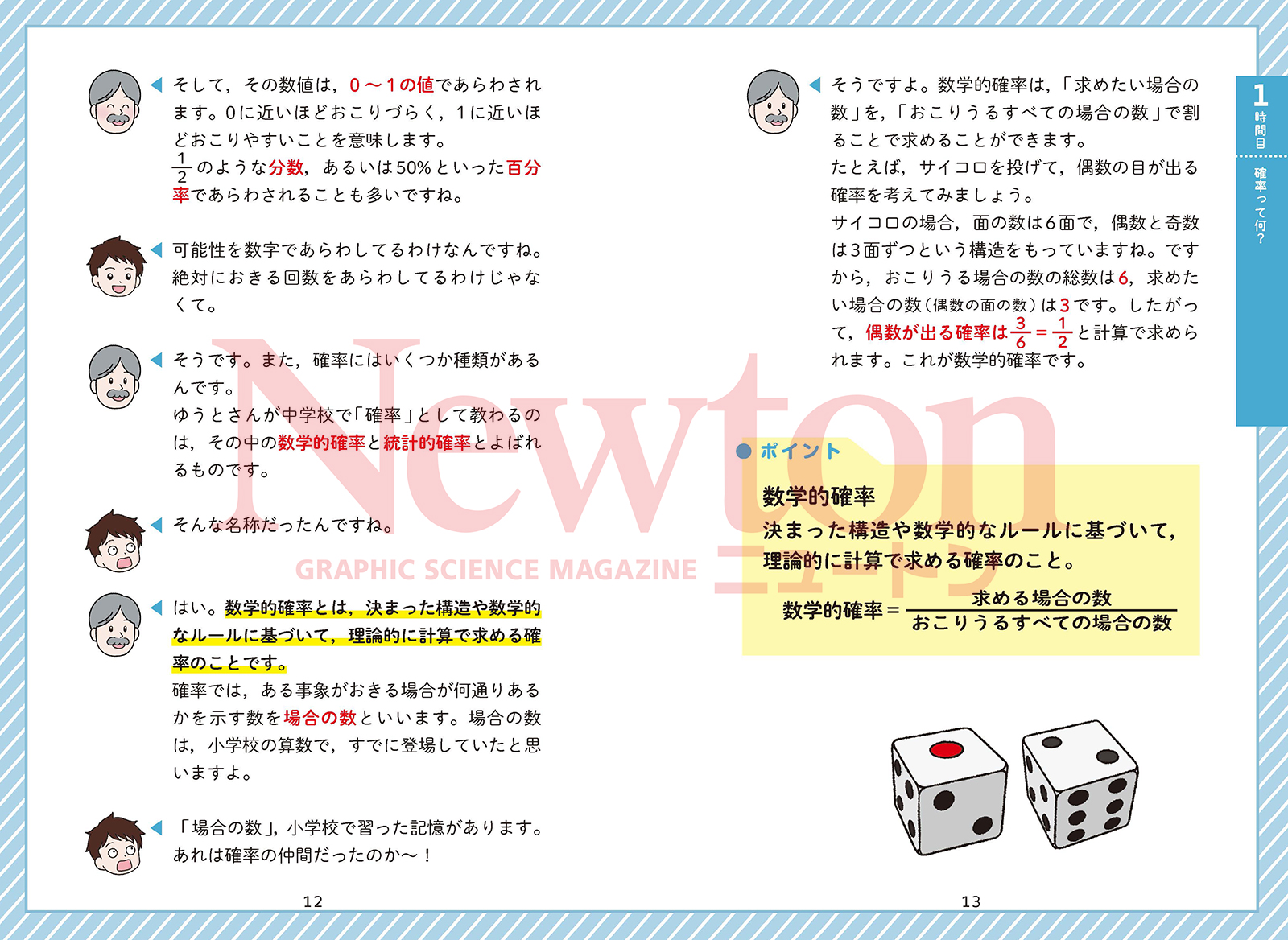 「明日は傘は必要だろうか」,「こっちの高校を受験したほうがいいだろうか」,「宝くじはバラと連番のどちらがいいだろうか」など,人生にはさまざまな選択肢があらわれます。そのたびに私たちは迷い,最善と思われる選択をします。しかし,その選択はしばしば失敗します。だからこそ私たちは迷い,よりよい選択のためにあらゆる判断材料を必要とします。 その判断材料の一つとなるのが「確率」です。確率とは,「おきるかどうかわからない事象がおきる可能性はどれぐらいか」を理論的な計算によって導きだし,数値化したものです。「降水確率」「合格率」「当選確率」など,私たちの身の回りにはさまざまな確率が存在します。判断に迷ったとき,確率の数値は客観的な判断材料となり,「降水確率5%なら傘はいらないか」といった合理的な判断が可能になります。 本格的な確率論が誕生したのは,17世紀のサイコロ賭博がきっかけだといわれています。賭博好きの貴族による「勝負が途中で終わった場合,賭け金を公平に分配するにはどうしたらいいか」という相談がきっかけでした。この相談に答えたのが,フェルマーの定理で知られるピエール・ド・フェルマーと,「人間は考える葦である」でも有名なブレーズ・パスカルです。彼らは手紙でやりとりをし,ギャンブラーそれぞれの勝率を計算し,その勝率に応じた比率で賭け金を分配する案を導きだしました。これが確率論のもとになったのです。 本書は,「確率」についてのニュートン先生の講義です。確率論を知り,よりよい選択の材料にすることができれば,人生をさらに豊かなものにしていけるのではないでしょうか。ニュートン先生の確率講義を,ぜひお役立てください。 |