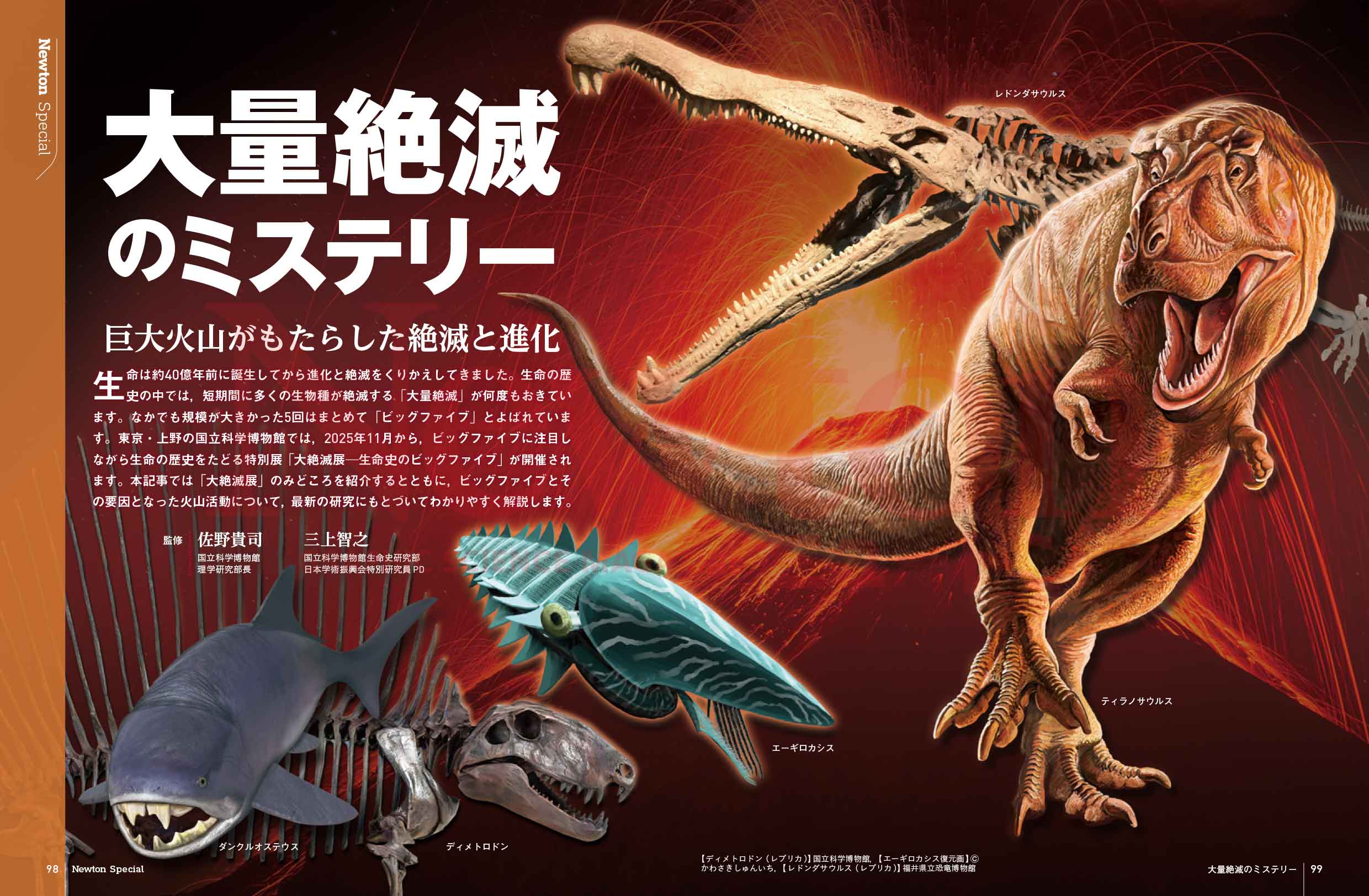 生命に大打撃をあたえた5回の大量絶滅「ビッグファイブ」について,原因となった火山活動とともに解説する。東京・上野で開催される特別展「大絶滅展」のみどころも紹介する。