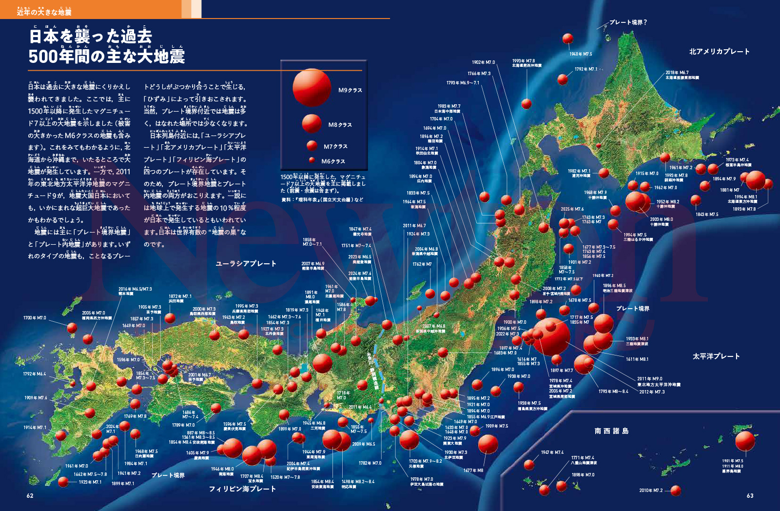 なぜ日本列島は大きな地震にたびたびおそわれるのでしょうか。それは日本が四つのプレートがぶつかり合うという,世界的にもめずらしい場所に位置しているからです。本書では,発生確率が高く,発生すると大きな被害が予想される南海トラフや首都圏直下地震について,そのメカニズムや被害予測をくわしく解説しています。また地震の基礎知識についてわかりやすく解説し,日本全国の危険な活断層や,各地の地震発生確率,世界の巨大地震とプレートとの関係などを紹介しています。2011年の東北地方太平洋沖地震,2024年の能登半島地震の真相にもせまります。 |